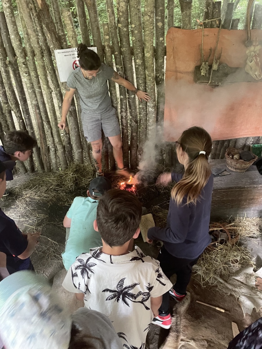 Lundi 2 juin : sortie au CAIRN avec toute l’école. Au programme découverte du parc avec observation de différents lieux, objets et mode de vie des hommes préhistoriques. Puis nous avons visité le musée. Ensuite nous avons fait un atelier de gravure et enfin nous avons eu une démonstration du feu
