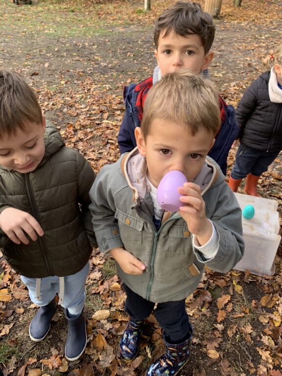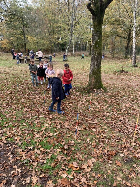 Après avoir fait une grande ronde, nous avons chanté et mimé la comptine de « la chasse à l’ours ». Nous devions traverser la forêt, escalader une montagne, passer dessous et par-dessus des obstacles, traverser une rivière pour revenir à la forêt.